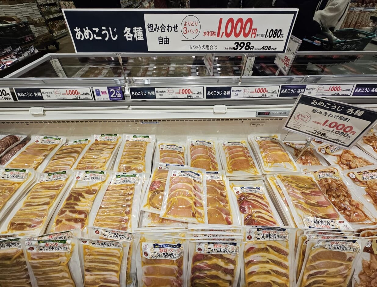 総菜に限らず、簡便食品も取り揃える。精肉売場では「鶏モモ肉スライスだし醤油漬け」(398円)や、鮮魚売場では「銀鮭のこうじ味噌漬け」(2切れ498円)など、店内随所であめこうじをPRしていた。