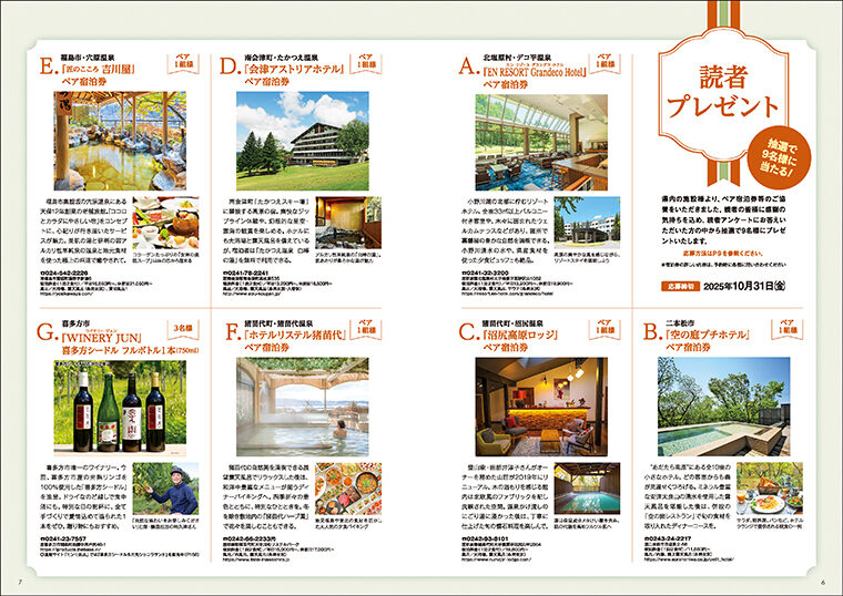また、本誌に掲載している宿の宿泊券などが当たる豪華な読者プレゼントも用意。抽選で9名様に当たります(本誌のP.9に掲載の二次元コードまたは官製ハガキで応募できます)。