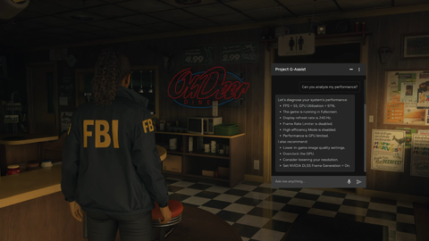 Project G-Assistは、ローカルで動作する小規模言語モデル(SLM)を使用し、ゲームやシステム設定の最適化、フレームレートの測定、対応デバイスのファン速度やライティング制御などをサポートするAIアシスタント機能。ユーザーは音声またはテキストコマンドでProject G-Assistと対話し、各種機能を実行できる。