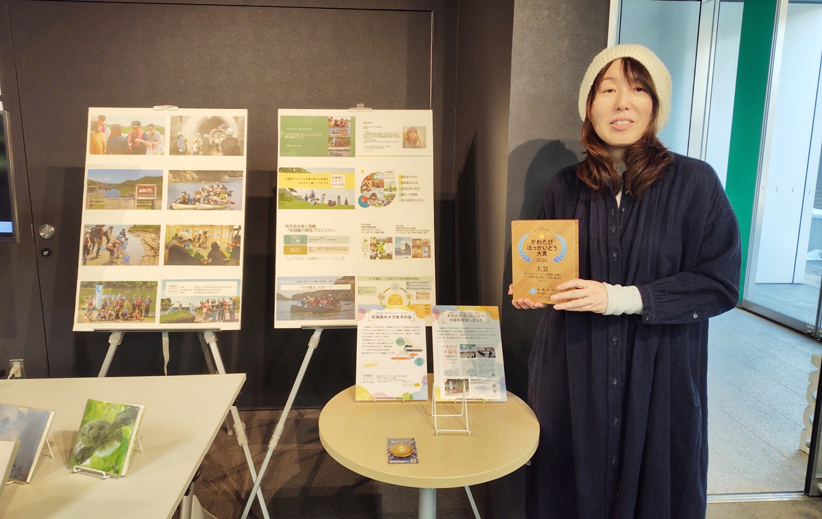 入口には、かわたびほっかいどうの盾、かわたび金バッチが置かれてありました。渡邉さんに写真に納まっていただきました。