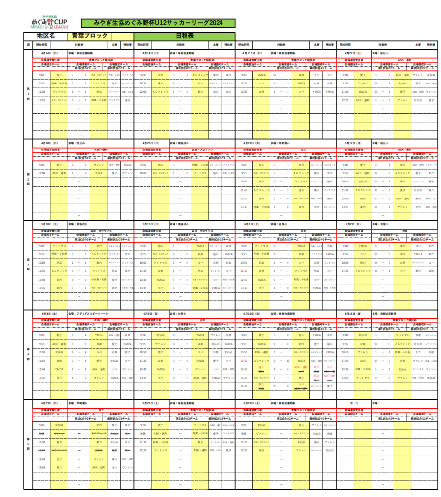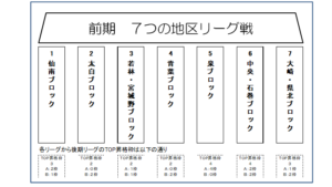 県内10ブロックを7ブロック(仙南、太白、若林・宮城野、青葉、泉、中央・石巻、大崎・県北)に分け、各チーム9試合以上ずつ行う。