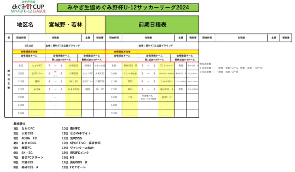 エスペランサ登米A、ジョイナス、大和、AOBA、ファナティコス宮城、ジュニオールイエロー、YMCA、愛子、Pgcom、鹿野イエロー