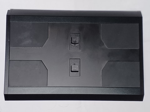 アケコン裏面、4隅にある銀色の部分がマグネットになっている。ここに蓋をはめ込むとコントローラーを振っても蓋が落ちるということはなかった。持ち運びやプレイ中の振動にも耐えられる設計だレバーレスとの融合。上ボタンとレバーのシナジーに迫る!