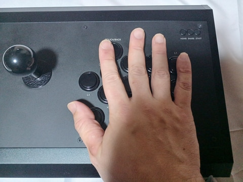 そして、大会シーンでの使用を想定する際、小型のコントローラーとなると不安視されるのが操作中のコントローラーが振動に耐えられるかどうかだ。家庭で用いる場合にはさほど問題とならないだろうが、コミュニティの対戦会や、大会シーンの場では、机の上にコントローラーを置いてプレイできるかはわからないず、膝の上にコントローラーを置いてプレイすることもある。その場合、プレイ中にコントローラーがズレず、ずっしりと安定しているかはかなり重要視される。普段は机置きでプレイしている筆者だが、膝置きで操作してみることにした。