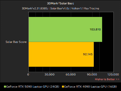 3DMarkの比較的軽量なレイトレーシングテスト「Solar Bay」でGeForce RTX 5090 Laptop GPUが記録したスコアは「103,810」で、GeForce RTX 4090 Laptop GPUの「92,145」を約13%上回った。