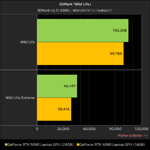GPU負荷の軽い通常版は「105,308」を記録したGeForce RTX 5090 Laptop GPUが、「99,870」を記録したGeForce RTX 4090 Laptop GPUを約6%上回った。一方、高負荷版では「46,147」を記録したGeForce RTX 5090 Laptop GPUが、GeForce RTX 4090 Laptop GPUの「39,416」を約17%上回った。