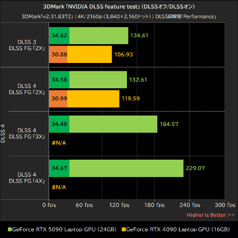 GeForce RTX 5090 Laptop GPUの「DLSSオフ」時のフレームレートは35fps弱。DLSS 3の超解像とフレーム生成を利用すると約3.9倍の134.61fpsに増加し、DLSS 4ではフレーム生成「2X」で約3.8倍の132.61fps、「3X」なら約5.4倍の184.57fps、「4X」では約6.6倍の229.07fpsにフレームレートが増加した。