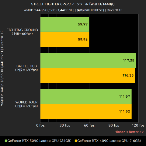 メインコンテンツのFIGHTING GROUNDでは両GPUとも上限の60fpsを維持できている。一方で、BATTLE HUBとWORLD TOURに関しては上限の120fpsをやや下回っているが、これは主にCPU性能が原因で生じたフレームレートの低下であり、両GPUともフルHD/1080pとWQHD/1440pで誤差程度の差しか生じていない。