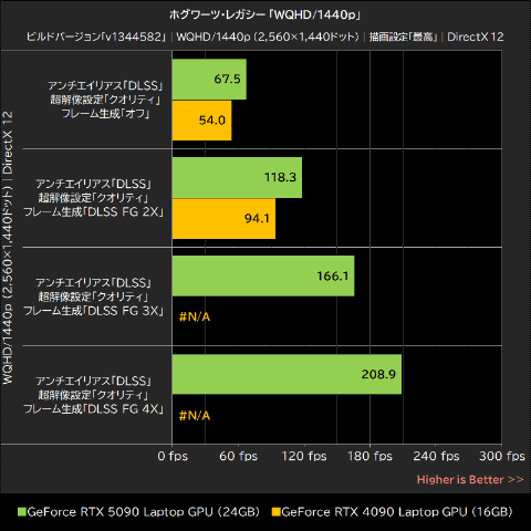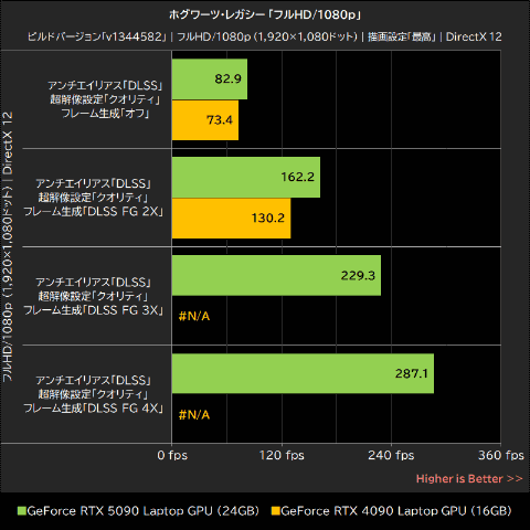 ホグワーツ・レガシーでは、フルHD/1080pとWQHD/1440pでDLSSフレーム生成の設定を変更しながら平均フレームレートを計測した。なお、グラフィックプリセットは「最高」で、計測はCPUボトルネックが生じにくい飼育場で実施している。