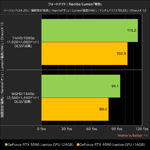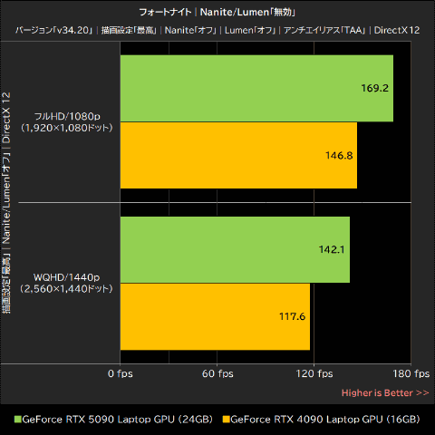Nanite/Lumen無効時のGeForce RTX 5090 Laptop GPUは、GeForce RTX 4090 Laptop GPUをフルHD/1080pで約15%、WQHD/1440pで約21%上回った。