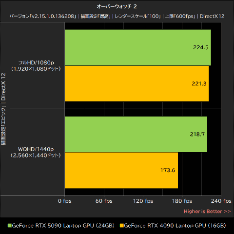 オーバーウォッチ 2では、グラフィックプリセットを最高の「エピック」に設定し、フルHD/1080pとWQHD/1440pで平均フレームレートを計測した。テスト時の上限フレームレートは600fpsで、グラフィックスAPIは「DirectX 12」。