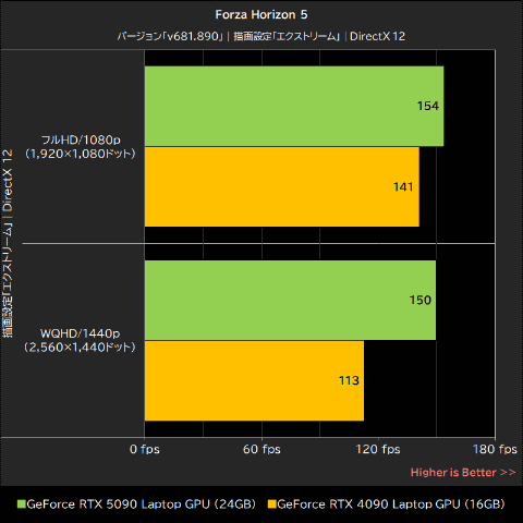 GeForce RTX 5090 Laptop GPUのスコアは、フルHD/1080pで約7%、WQHD/1440pで約2%、それぞれGeForce RTX 4090 Laptop GPUを上回った。