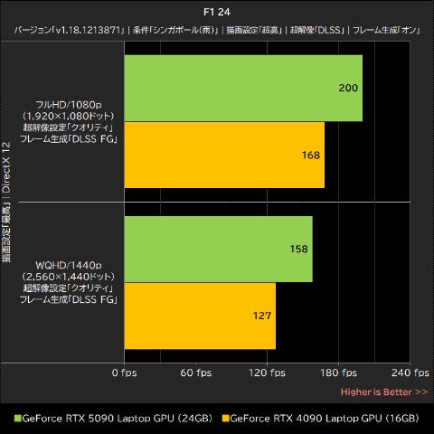 F1 24では、グラフィックプリセットを最高の「超高」、DLSS超解像とフレーム生成を有効に設定し、フルHD/1080pとWQHD/1440pでベンチマークモードを実行した。