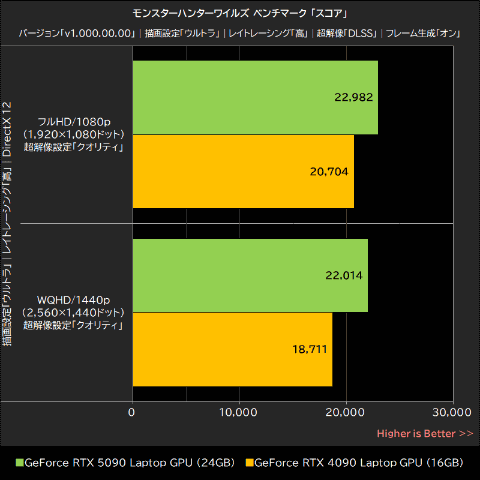 GeForce RTX 5090 Laptop GPUはGeForce RTX 4090 Laptop GPUをフルHD/1080pで約2%、WQHD/1440pで約23%上回った。