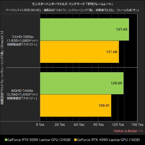 モンスターハンターワイルズ ベンチマークでは、グラフィックプリセットを「ウルトラ」、レイトレーシングを「高」、超解像を「DLSS(クオリティ)」、フレーム生成を「オン」に設定し、フルHD/1080pとWQHD/1440pでテストを実行した。