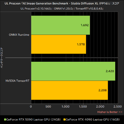 ONNX Runtimeで実行した場合、GeForce RTX 5090 Laptop GPUのスコアは「1,692」で、「1,578」のGeForce RTX 4090 Laptop GPUを約7%上回った。