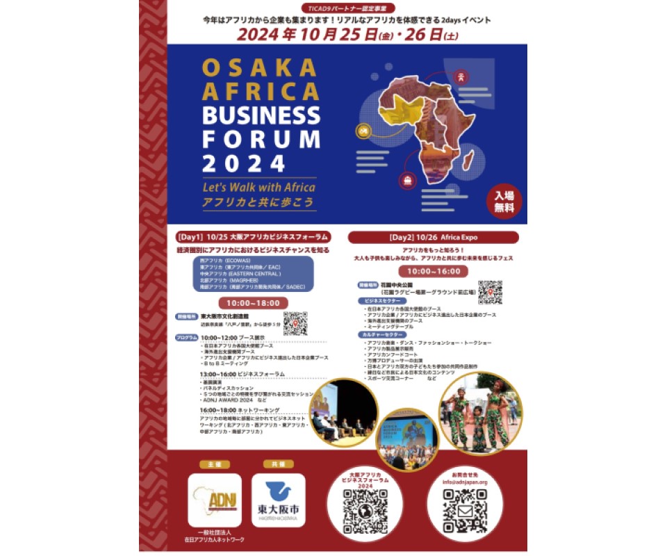 中小機構近畿本部は、在日アフリカ人ネットワークADNJ、大阪府東大阪市、大阪商工会議所との共催で、「大阪アフリカビジネスフォーラム2024」を10月25日、「AFRICA EXPO」を10月26日、いずれも東大阪市内で開催する。今年はアフリカ各国から40社の企業を招き、日本企業との具体的なパートナーシップ構築に向けた交流を図る。アフリカ文化に触れるイベントも開催され、ビジネス・文化両面からの交流促進を図る。