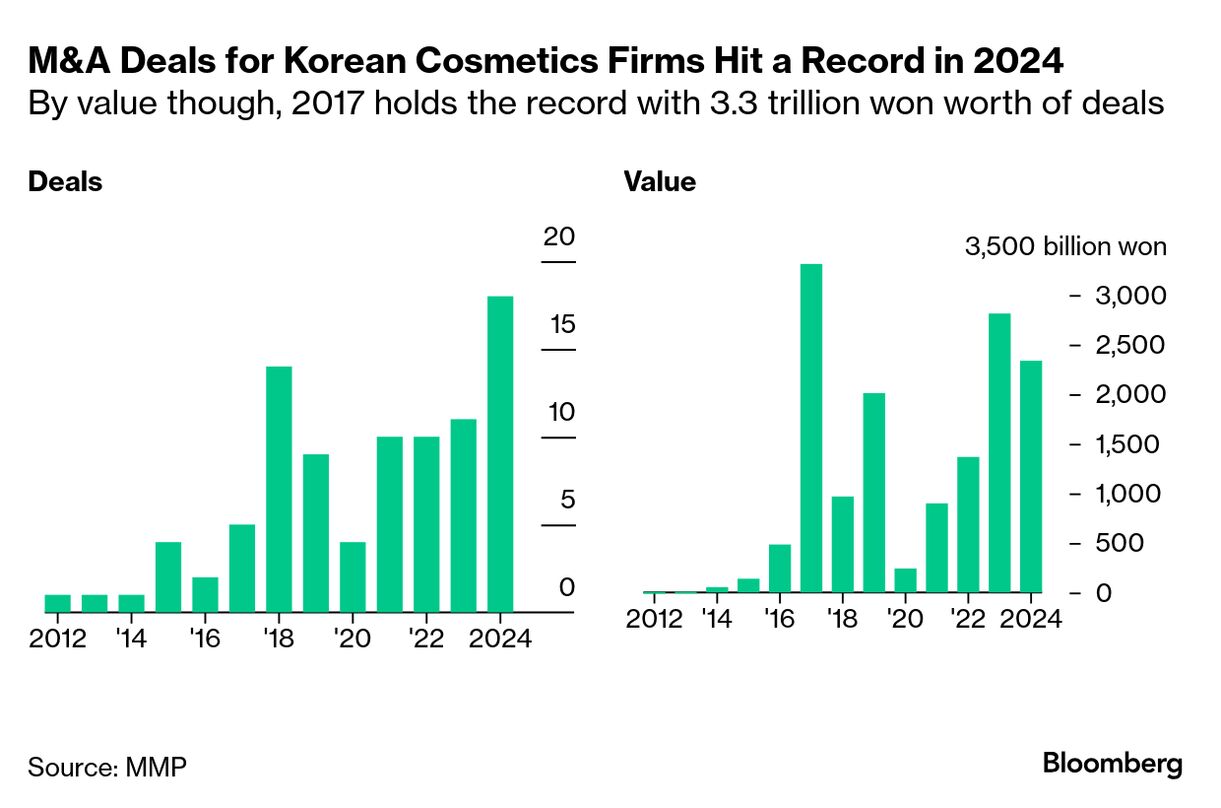 こうした成長ぶりを受け、フランスのロレアルなどは韓国のパーソナルケア資産に関心を寄せ、同業界では24年に2兆3000億ウォン(約2330億円)相当のディールが成立。件数ベースでは18件と記録的な数に上った。金額では過去最高に及ばなかったものの、ある助言会社はディールの勢いが続くと自信を示している。