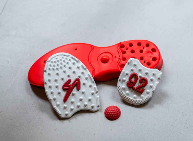 また、ソールの裏には「9.2」とゴルフボールが形どられており、バンカーに入った時などは、足跡として、「9.2」とゴルフボールのマークがつくのがユニーク。