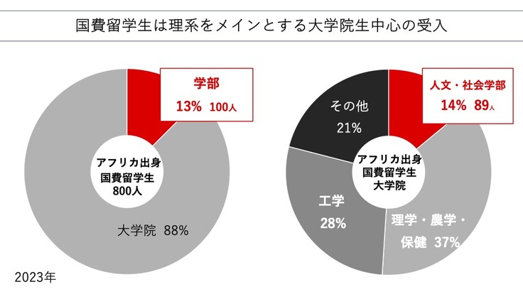 アフリカからの国費留学生は約800人で、そのうち学部生は100人程度です。JICAなどの支援は増えてきたものの、地域の重要性にもかかわらず、アフリカから日本への留学の道は依然として限定されています。