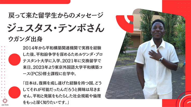 この制度によって、日本とアフリカの若者間の交流を促進することは、将来の両地域の関係の深化や、世界が抱えるさまざまな問題に共同で取り組むことにつながるでしょう。東京外大の交換留学制度の継続と発展を期待しています。
