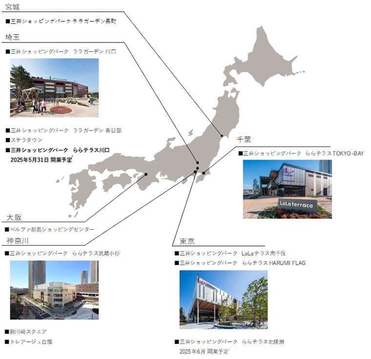 現在、「三井ショッピングパーク LaLaテラス南千住」(東京都荒川区、2004年開業)、「三井ショッピングパーク ららテラス武蔵小杉」(神奈川県川崎市、2014年開業)、「三井ショッピングパーク ららテラスTOKYO-BAY」(千葉県船橋市、2023年開業)、「三井ショッピングパーク ららテラスHARUMI FLAG」(東京都中央区、2024年開業)」を運営しているほか、「三井ショッピングパーク ららテラス北綾瀬」(東京都足立区、2025年6月開業予定)の開発を推進中です。