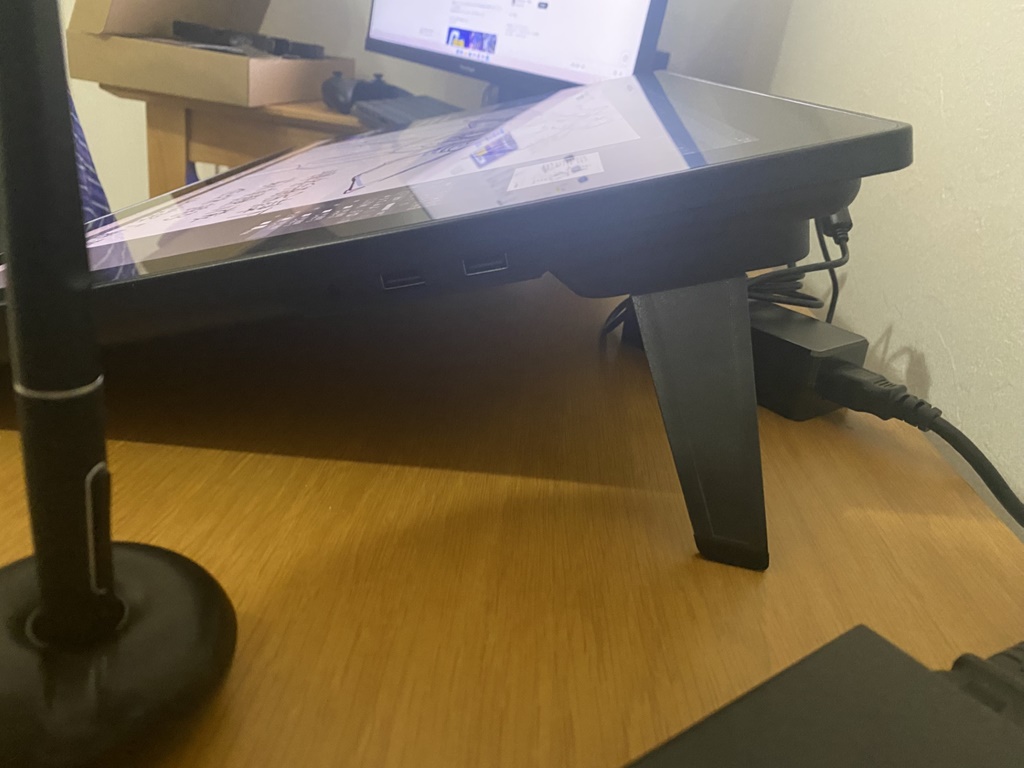 オプション商品を購入すれば調整可能みたいです。付属しておいて欲しかったと強く感じます。なぜならペンの傾き検知や描き心地は、画面角度によって実感が大きく変わるからです。画面を自分の描きやすい角度に調整することによって、ペン先がフィットする感覚に近づけることができます。