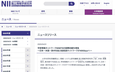 大学共同利用機関法人情報・システム研究機構国立情報学研究所(NII)は4月1日、学術情報ネットワーク「SINET6」(Science Information NETwork)の国際回線において、日本-米国-欧州を結ぶネットワークのすべての帯域を400Gbpsに増強し、2025年4月に運用開始したことを発表した。