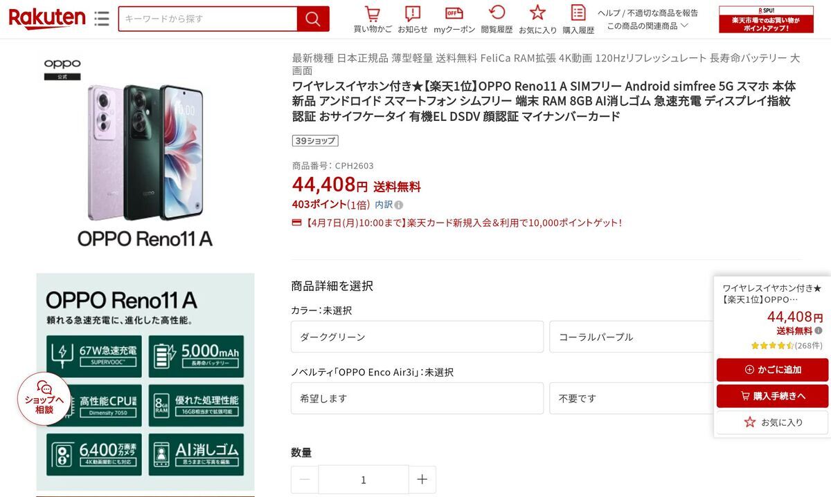 OPPO公式 楽天市場店は、2025年4月6日までに「OPPO Reno11 A」の販売価格を4万4408円に変更しました。