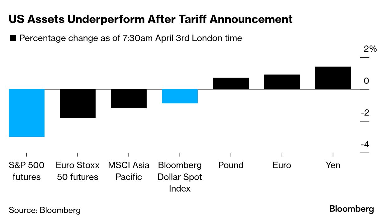 米株価指数先物は2日の市場終了後にトランプ氏が大規模な一連の関税を発表したことを受けて、4%以上急落。ドル指数も大きく下落した。