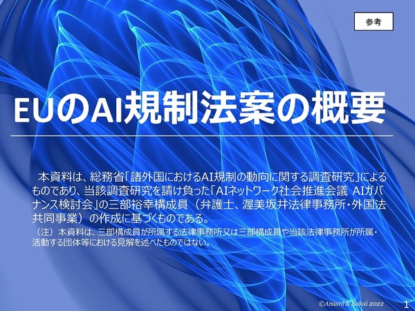 生成AIが急速に普及する中、とどまることのないAIの能力向上に法の力でブレーキを掛ける動きが活発になっている。EUのAI規制法に関しては、海外だけでなく、日本でも、草案段階から同法の規制内容が多く議論されてきた。例えば、総務省は2022年に「EUのAI規制法案の概要」という21ページにわたるPDF資料を公表している(図1)。