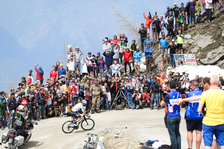 元軍用道路であるこの登りは登坂距離18kmで、平均勾配は9%オーバー。約10kmを過ぎた辺りから舗装路は砂利道に代わり、蛇行した登りを標高2,178mまで登っていく。その頂上はフィニッシュ地点ではなく、選手たちは11kmの下りを経て、3級山岳のセストリエーレを登る。そこでマリアローザを纏う選手が、第108回大会の総合優勝者に輝く。