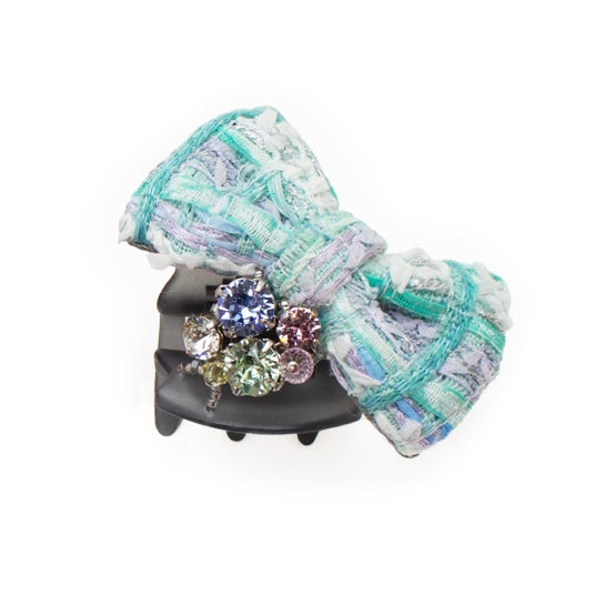 今回はマリアケント社が展示会で使用したサンプルを使用。グラデーションの美しい色柄と風合いが特徴的なツイード生地に、スワロフスキー(R)・クリスタルを組み合わせました(ヘアバンド除く)。全く同じものは無く、ひとつひとつ異なるニュアンスも魅力です。エレガントでフェミニン、唯一無二の雰囲気をお楽しみください。