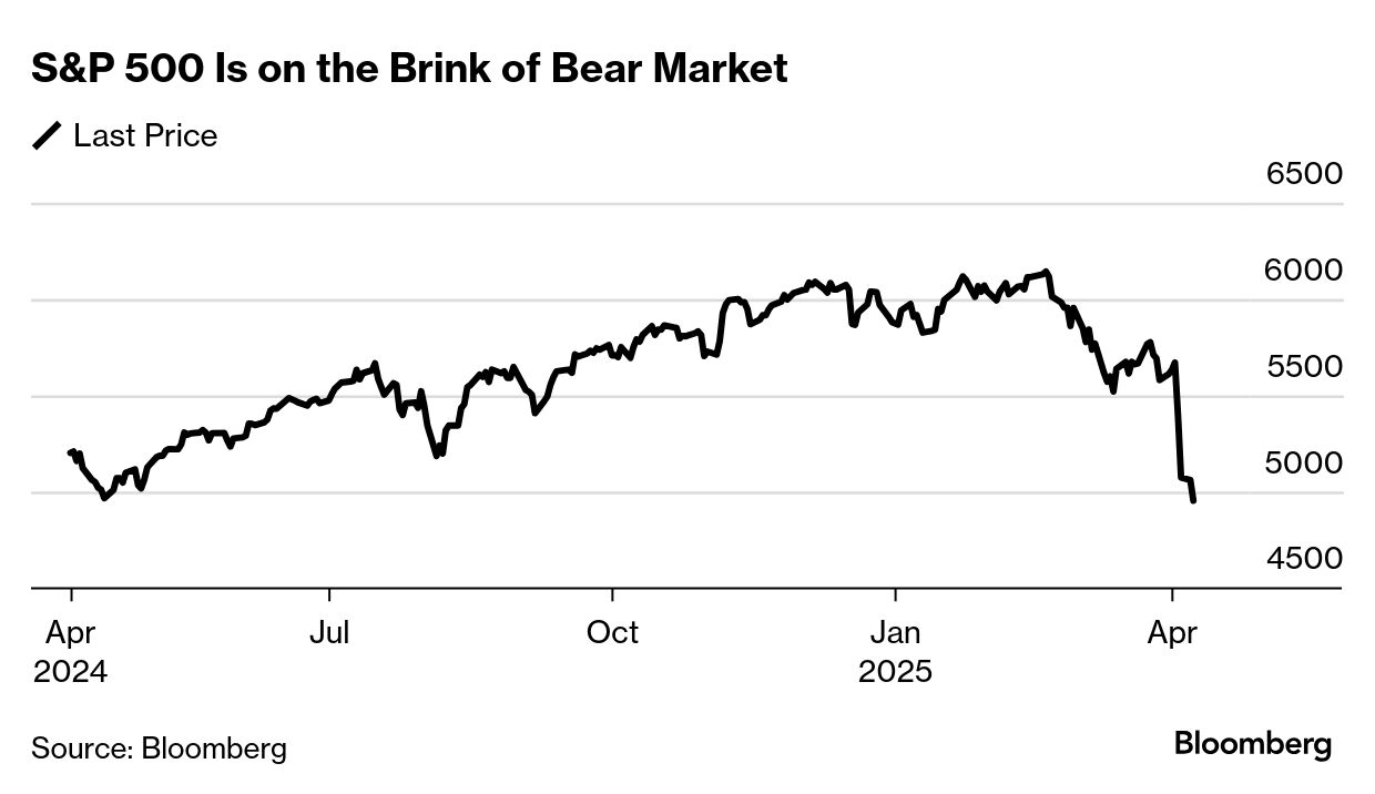 8日の米株式相場は下落。関税を巡る米中間の応酬が重しになった。4営業日連続で大きく揺れ動く展開となり、S&P500種株価指数は弱気相場入りの瀬戸際まで下げた。