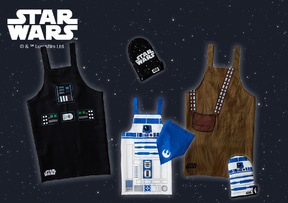 特に注目なのが、主要キャラクターをモチーフにしたエプロン。R2-D2やダースベイダー、チューバッカなど、身につけるだけで台所が壮大な宇宙の物語の舞台になる。三角巾付きのセットもあり、価格は4180円~4400円。