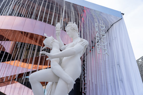 劇場の舞台を想像させる建物のなかへいざ! 遠くから見るとリボンのように見える階段を上がっていく