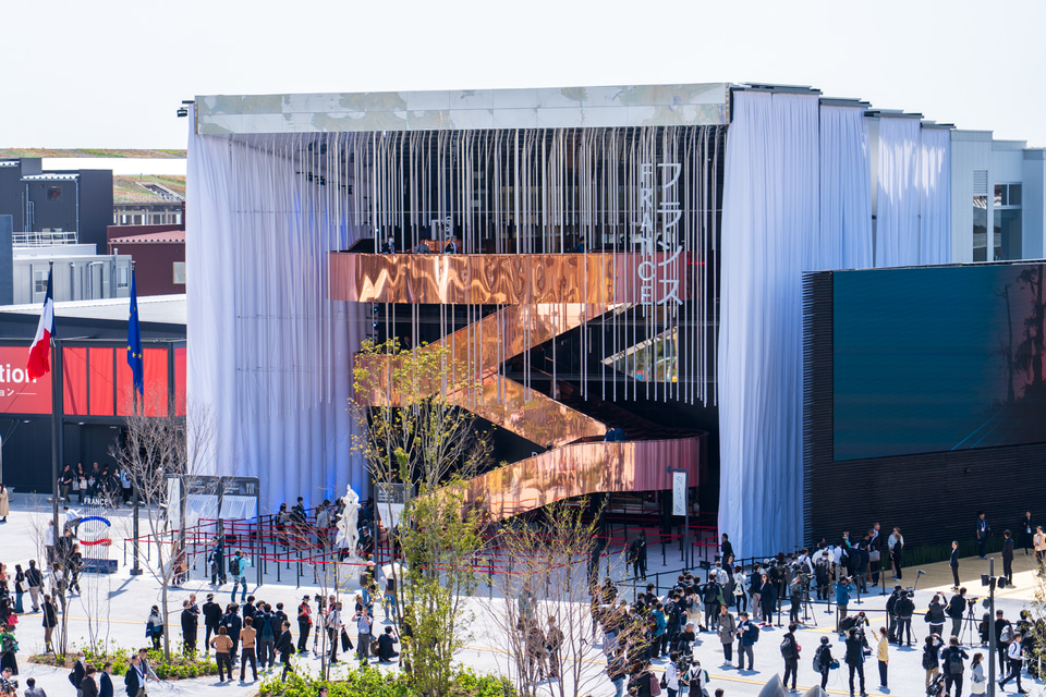 建物全体がドレーブで覆われたデザインのフランスパビリオンを大屋根リングから