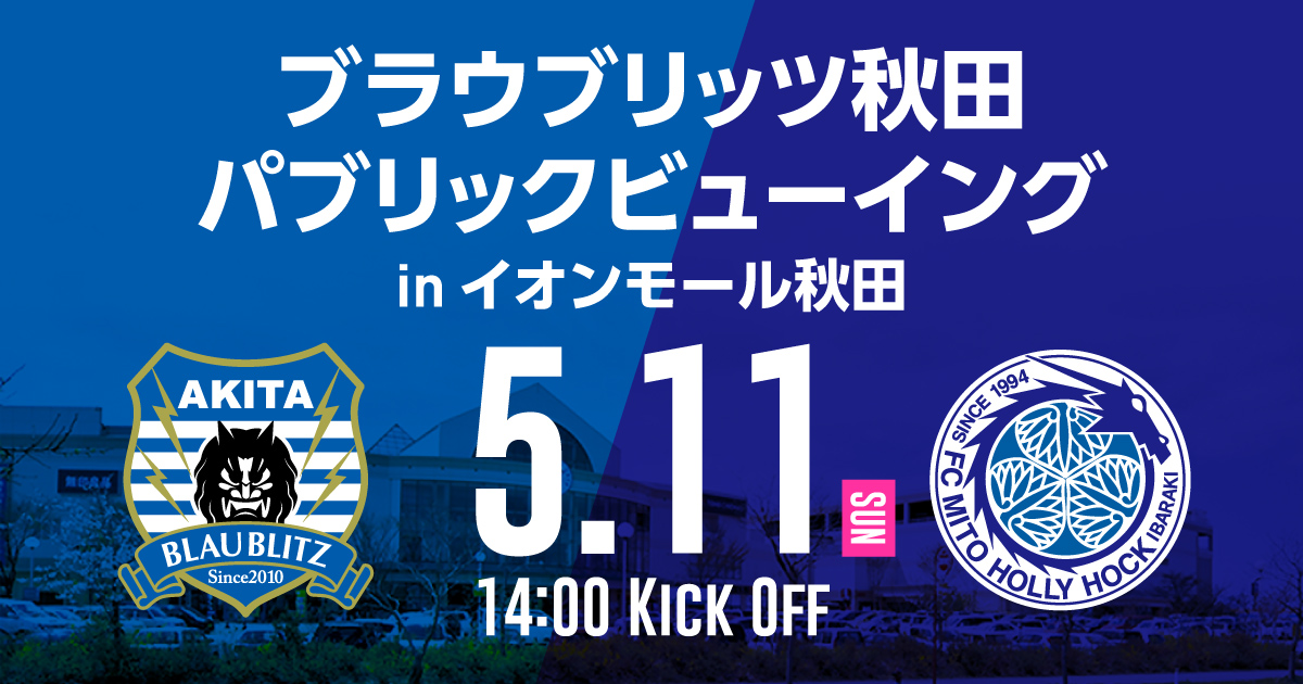 この度、5月11日(日) 14時キックオフの「2025明治安田J2リーグ第15節 水戸ホーリーホック vs ブラウブリッツ秋田」について、イオンモール秋田にてパブリックビューイングを開催することとなりましたので、お知らせいたします。