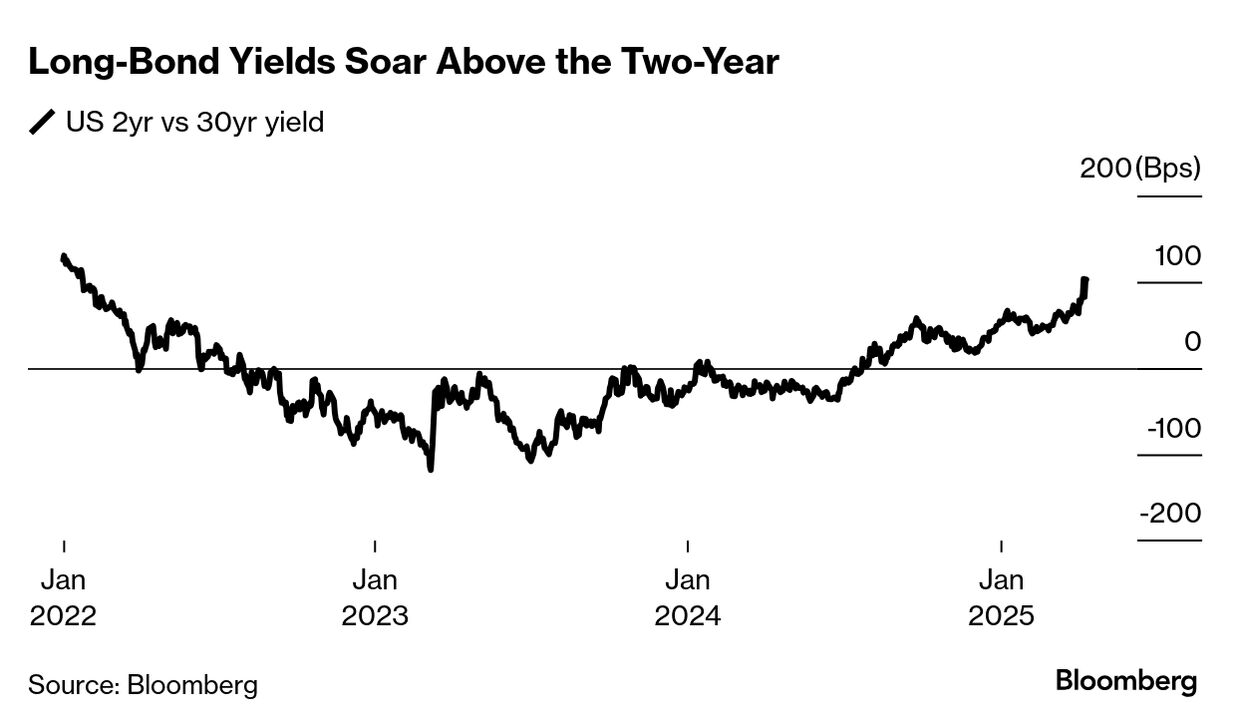 30年債の2年債に対する利回り上乗せ幅(スプレッド)は9週連続で拡大。これはブルームバーグがデータ収集を開始した1992年以降では、過去に1回しか見られなかった動きだ。先週にはスプレッドは2022年以来の水準に達し、こうした動きを見越してポジションを取っていたダブルラインなどの資産運用会社に追い風となった。
