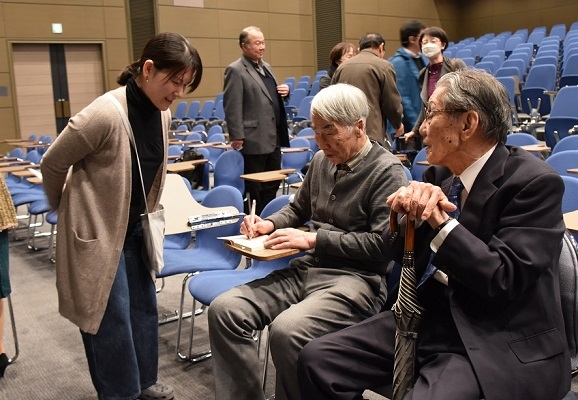 ▲翻訳した本にサインをする木村氏(中央)