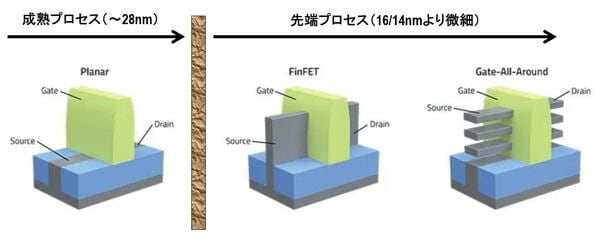 トランジスタの形状でいえば、プレーナ型のトランジスタを使っている半導体が成熟プロセスで、FinFETおよびGAA(Gate All Around)のトランジスタを使う半導体が先端プロセスと言える(図1)。