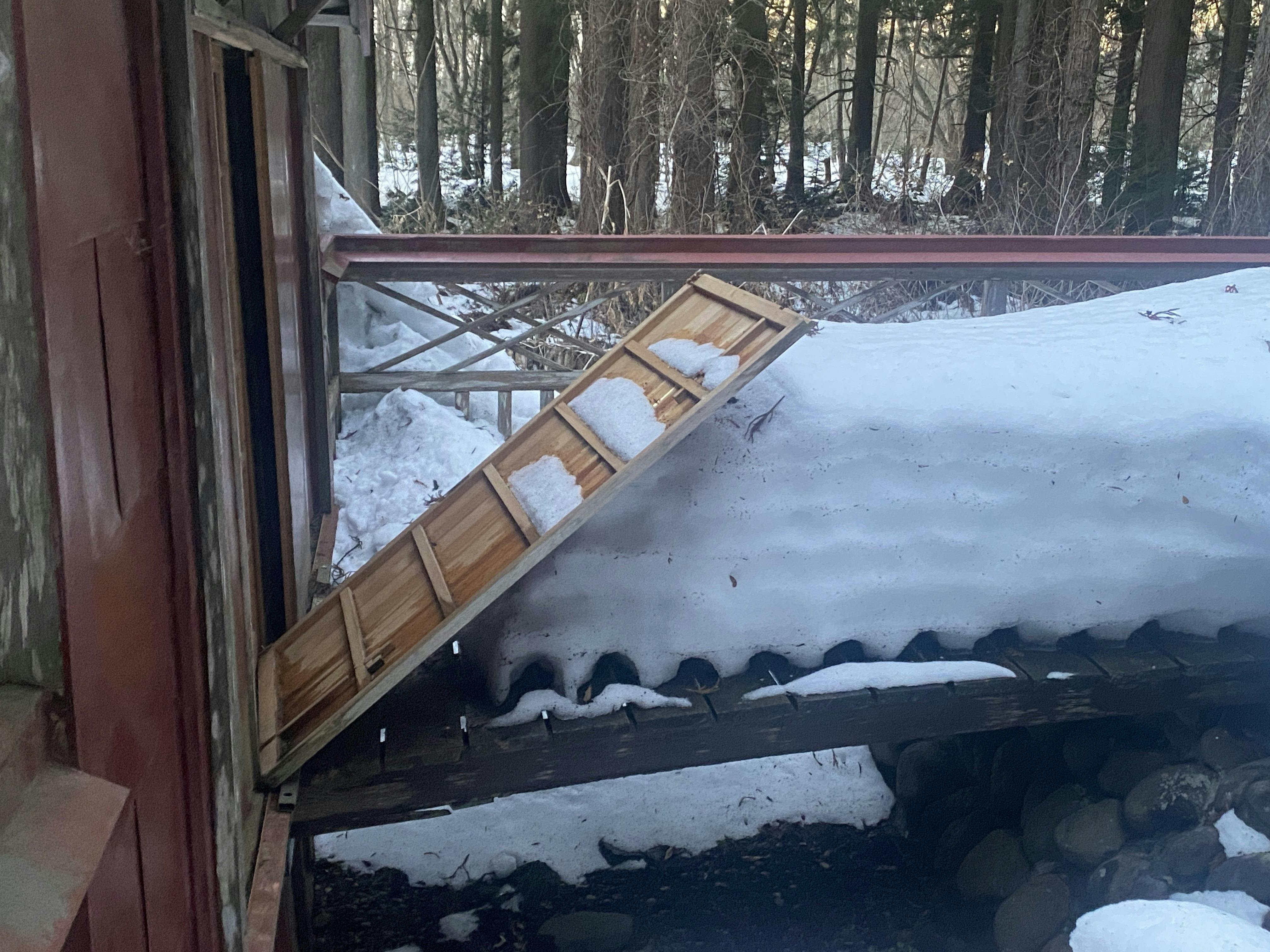 大雪で戸口が圧迫されて損壊し、雪解け後にそれが緩んで戸が外れてしまいました。