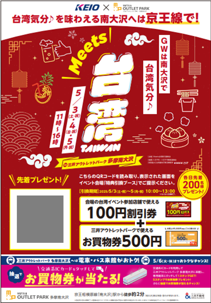 京王電鉄株式会社(本社:東京都多摩市、代表取締役社長:都村 智史)では、三井不動産商業マネジメント株式会社(本社:東京都中央区、代表取締役社長:大林 修)が実施する「Meets 台湾 in 三井アウトレットパーク 多摩南大沢」(以下「Meets 台湾」)」の開催に合わせ、5月3日(土・祝)~5月5日(月・祝)に「Meets 台湾」ならびに「三井アウトレットパーク 多摩南大沢(以下「アウトレット」)」で使える「割引券・お買物券プレゼントキャンペーン」を実施します。