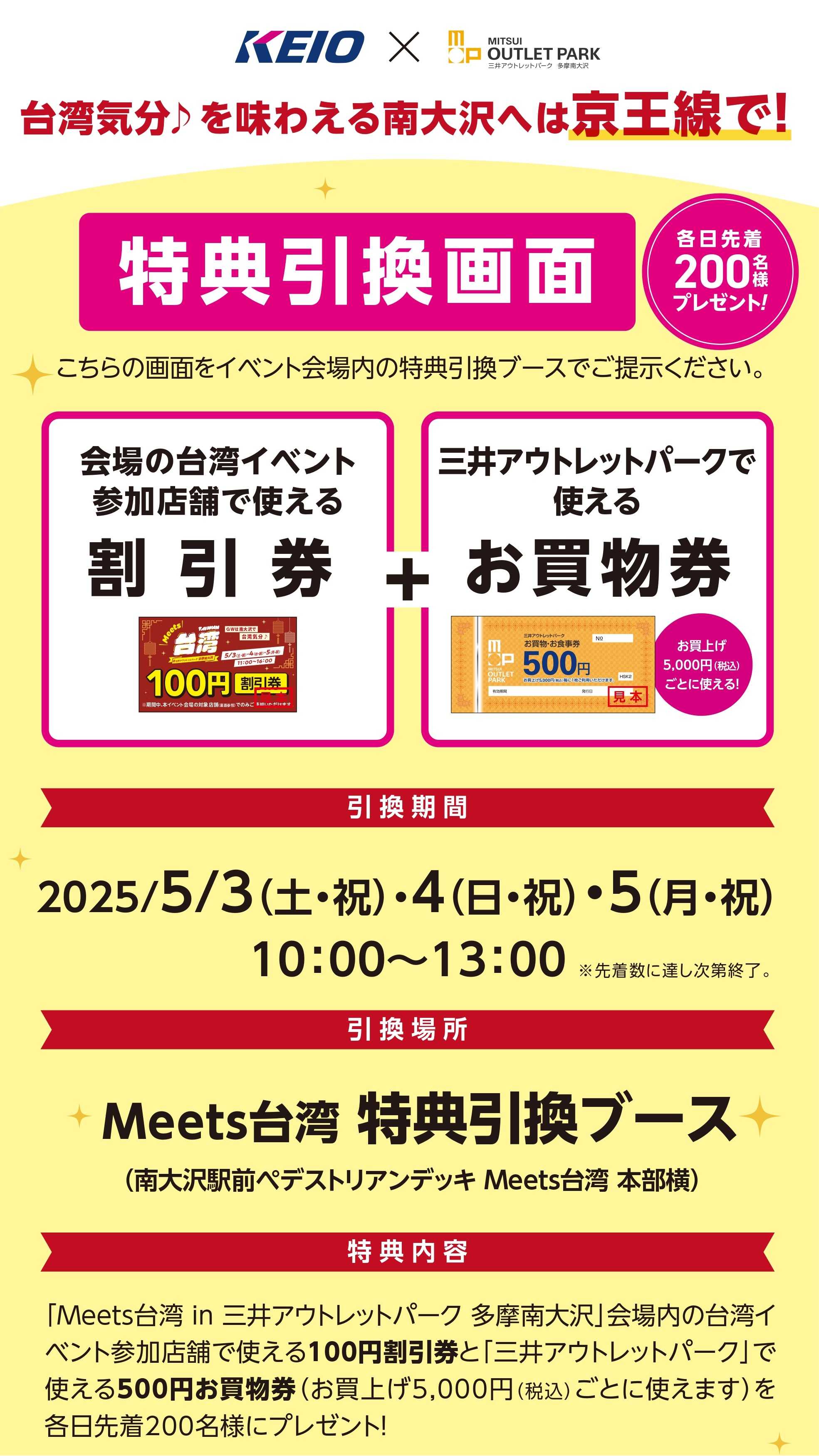 「京王線・井の頭線車内、各駅に掲出するポスターに記載された二次元コードを読み込んで表示された画面」または「京王アプリ配信投稿に記載のURLからアクセスし表示された画面」をイベント会場内特典引換ブースで提示すると、「Meets 台湾」とアウトレットで利用できる割引券・お買物券を各1枚プレゼントします。