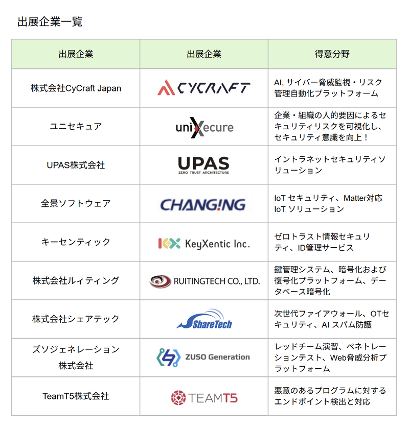 これら9社が共同で台湾のサイバーセキュリティ技術力とグローバルな連携の可能性を発信します。