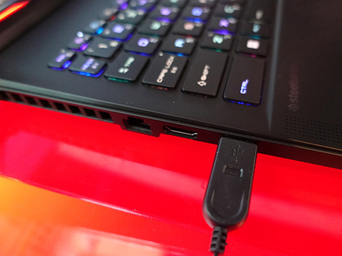 他の主な仕様は、キーボードがSteelSeries Per-Key RGB日本語キーボード、スピーカーがステレオ2スピーカー+4ウーファー(Sound by DYNAUDIO)、本体サイズが355.8×259.7×19.95mm、本体質量が約2.1kg。
