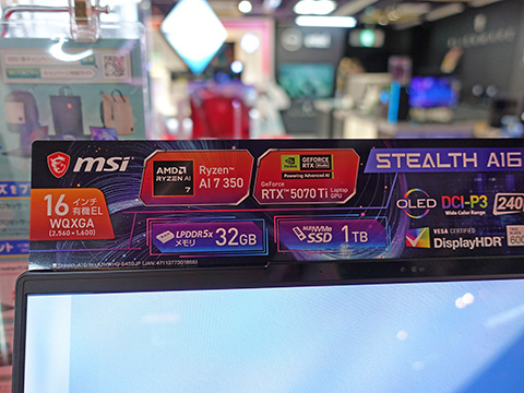 AMD Ryzen AI 7 350やGeForce RTX 5070 Ti Laptop GPUを搭載したMSI製ノートPC「Stealth-A16-AI+A3HWHG-6459JP」がソフマップAKIBA パソコン・デジタル館に入荷。