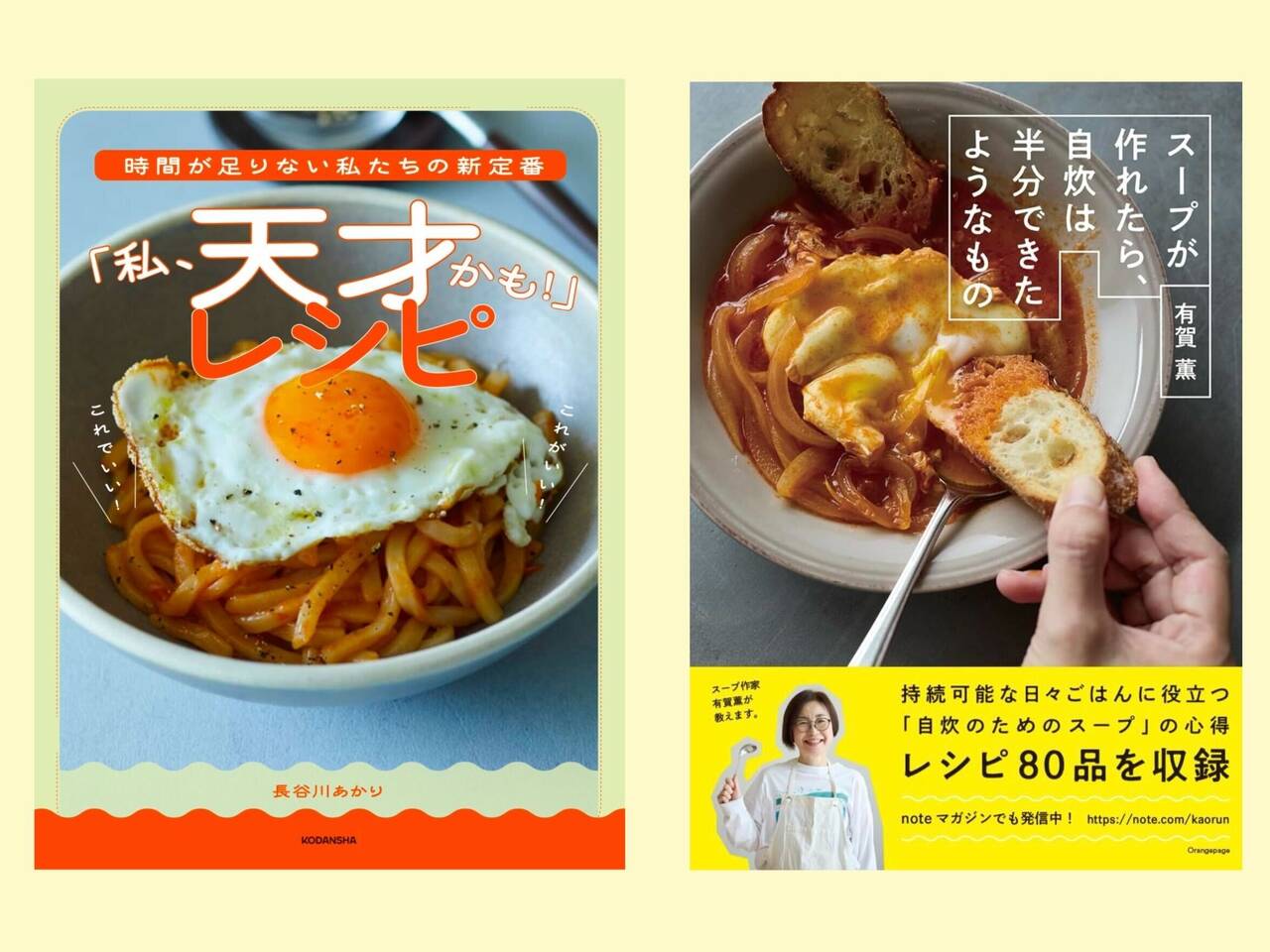 今年2月、有賀薫さんの『スープが作れたら、自炊は半分できたようなもの』(オレンジページ刊)、長谷川あかりさんの『時間が足りない私たちの新定番「私、天才かも!」レシピ』(講談社刊)という書籍が発売になりました。偶然にも、自炊がもっとおいしく楽しくなる、料理初心者にも嬉しいヒントがいっぱいの2冊です。