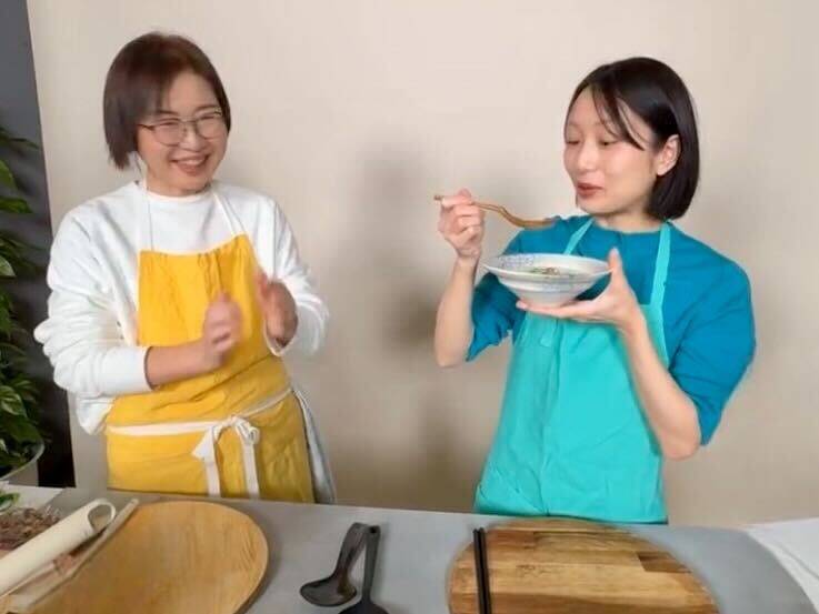 長谷川さん レタスの青々しい香りがしっかりあって、おいしい! お鍋に入れたら余熱でさっと仕上げて、火を入れすぎないのがポイントですね。素材それぞれの味を楽しめるやさしいバランスが、疲れているときにぴったりなスープだと思います。有賀先生から学んだことの一つは、レシピの展開しやすさ。基本を押さえておけば、材料を代えるなどアレンジ次第で何通りにも広がるのが嬉しいです