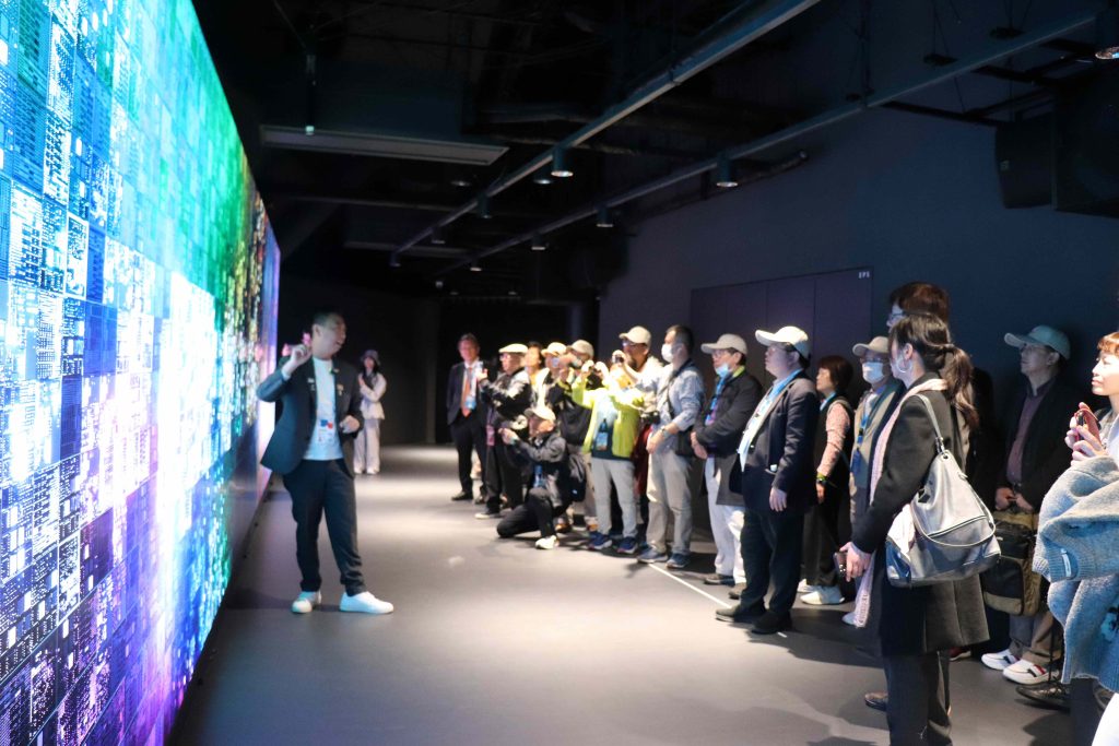 中に一歩入ると、花に見立てた560台のモニターが動き、円筒のスクリーンに台湾の豊かな自然をイメージした画像が浮き上がる。樹木の香りやスモークの演出もあり、五感でハイテクと自然の融合を楽しむことができる。
